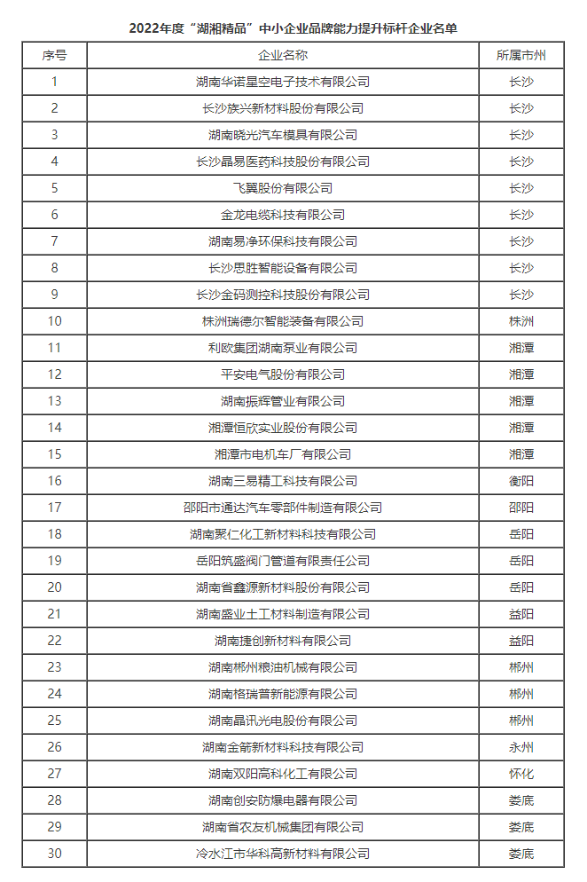 根據(jù)《“湖湘精品”中小企業(yè)品牌能力提升三年行動(dòng)計(jì)劃(2021-2023年)》和《關(guān)于征集2022年度“湖湘精品”中小企業(yè)品牌能力提升標(biāo)桿企業(yè)的通知》要求,經(jīng)試點(diǎn)企業(yè)申報(bào)、市州工信局推薦、專家評(píng)審及公示等程序,省工信廳遴選出30家企業(yè)為2022年度“湖湘精品”中小企業(yè)品牌能力提升標(biāo)桿企業(yè),現(xiàn)予公布。