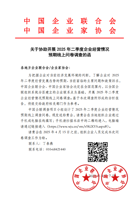 關于協(xié)助開展 2025 年二季度企業(yè)經(jīng)營情況預期線上問卷調查的函