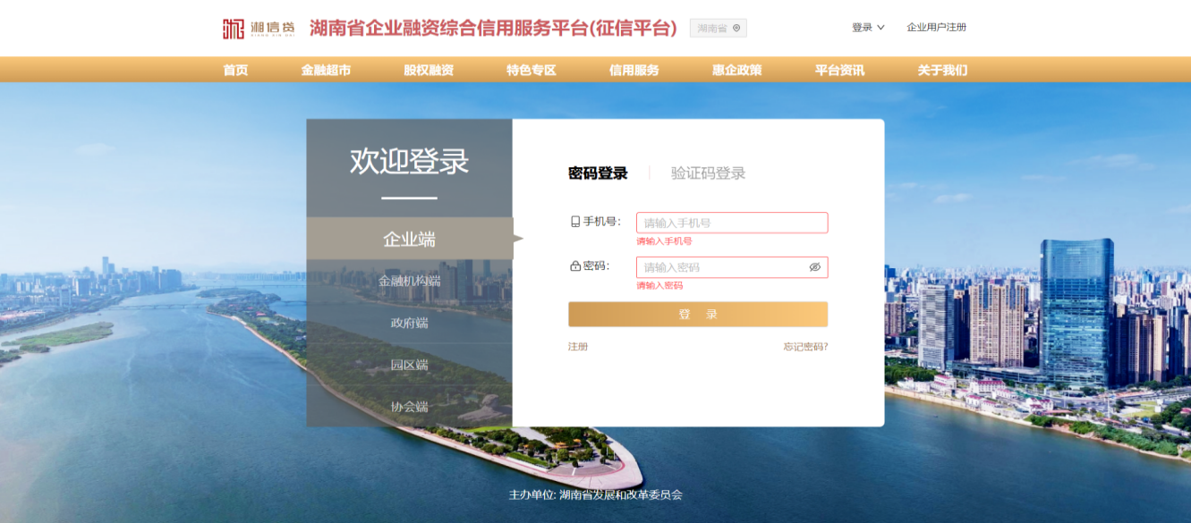 1、在“登錄頁面”左下角點擊“注冊”按鈕或在“湘信貸”平臺網(wǎng)站右上角,點擊“企業(yè)用戶注冊”按鈕,進入注冊頁面。