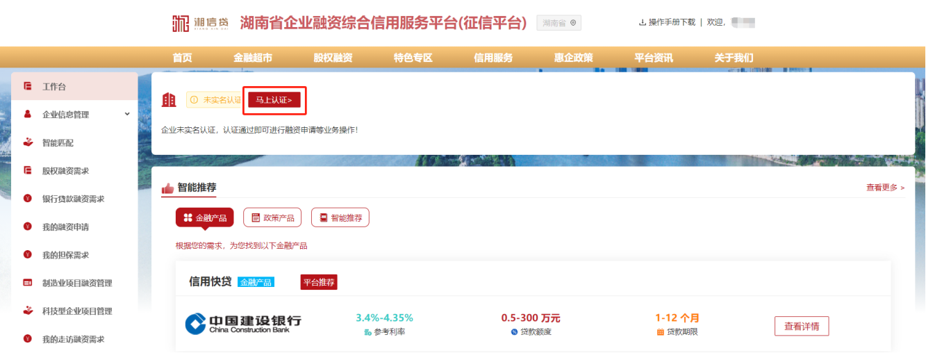 3、注冊完成登錄企業(yè)后端工作臺后,點擊頁面“馬上認證”按鈕,進行企業(yè)實名認證核驗。