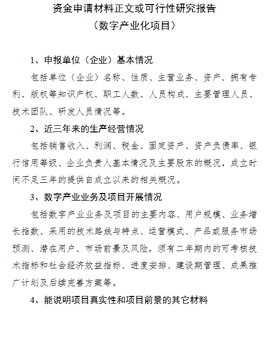 1)數字產業(yè)化項目。主要支持互聯(lián)網、軟件和信息服務等服務業(yè)和電子信息制造、企業(yè)信息化建設等制造業(yè)企業(yè)項目;