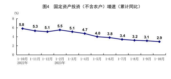1-10月份,全國(guó)固定資產(chǎn)投資(不含農(nóng)戶)419409億元,同比增長(zhǎng)2.9%,比1-9月份回落0.2個(gè)百分點(diǎn)。分領(lǐng)域看,基礎(chǔ)設(shè)施投資同比增長(zhǎng)5.9%,制造業(yè)投資增長(zhǎng)6.2%,房地產(chǎn)開發(fā)投資下降9.3%。全國(guó)商品房銷售面積92579萬(wàn)平方米,同比下降7.8%;商品房銷售額97161億元,下降4.9%。分產(chǎn)業(yè)看,第一產(chǎn)業(yè)投資同比下降1.3%,第二產(chǎn)業(yè)投資增長(zhǎng)9.0%,第三產(chǎn)業(yè)投資增長(zhǎng)0.4%。民間投資下降0.5%,降幅比1-9月份收窄0.1個(gè)百分點(diǎn);扣除房地產(chǎn)開發(fā)投資,民間投資同比增長(zhǎng)9.1%。高技術(shù)產(chǎn)業(yè)投資同比增長(zhǎng)11.1%,其中高技術(shù)制造業(yè)和高技術(shù)服務(wù)業(yè)投資分別增長(zhǎng)11.3%、10.5%。高技術(shù)制造業(yè)中,航空、航天器及設(shè)備制造業(yè),醫(yī)療儀器設(shè)備及儀器儀表制造業(yè)投資分別增長(zhǎng)19.0%、16.7%;高技術(shù)服務(wù)業(yè)中,科技成果轉(zhuǎn)化服務(wù)業(yè)、專業(yè)技術(shù)服務(wù)業(yè)投資分別增長(zhǎng)37.3%、29.1%。10月份,固定資產(chǎn)投資(不含農(nóng)戶)環(huán)比增長(zhǎng)0.10%。
