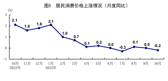 10月份,全國(guó)居民消費(fèi)價(jià)格(CPI)同比下降0.2%,環(huán)比下降0.1%。分類別看,食品煙酒價(jià)格同比下降2.1%,衣著價(jià)格上漲1.1%,居住價(jià)格上漲0.3%,生活用品及服務(wù)價(jià)格下降0.6%,交通通信價(jià)格下降0.9%,教育文化娛樂(lè)價(jià)格上漲2.3%,醫(yī)療保健價(jià)格上漲1.3%,其他用品及服務(wù)價(jià)格上漲3.6%。在食品煙酒價(jià)格中,豬肉價(jià)格下降30.1%,鮮菜價(jià)格下降3.8%,糧食價(jià)格上漲0.6%,鮮果價(jià)格上漲2.2%??鄢称泛湍茉磧r(jià)格后的核心CPI同比上漲0.6%。1-10月份,全國(guó)居民消費(fèi)價(jià)格同比上漲0.4%。